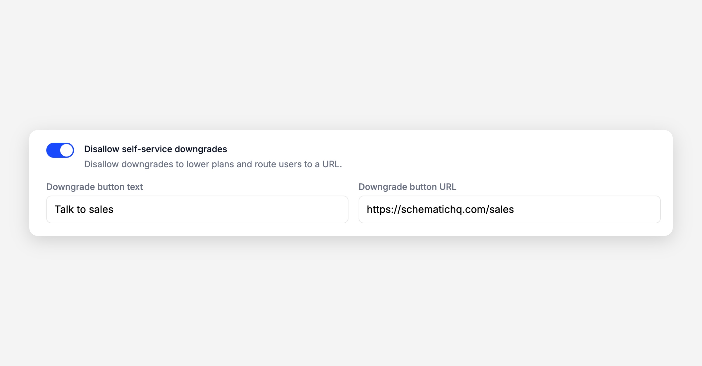 Disallow downgrades in checkout and instead send users to an outside page. Useful for sales-led environments where account expansion is self-service but account contraction is done with a rep. Configure in Catalog Configuration page.